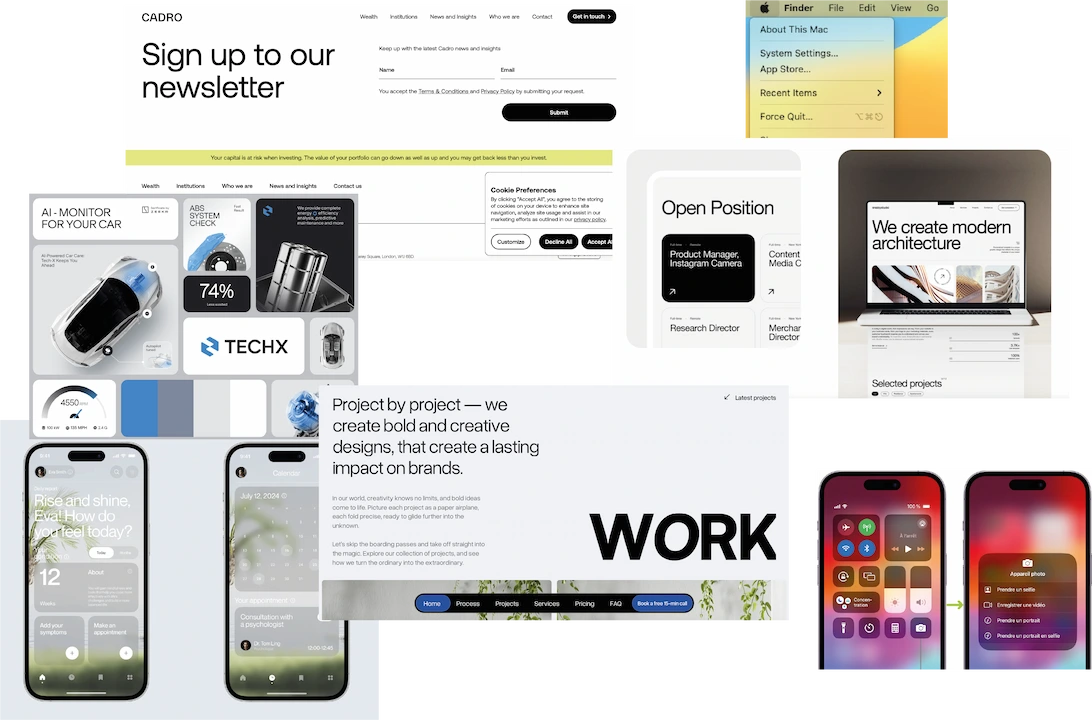 Bento design. Il organise l’interface en blocs carrés ou rectangulaires, inspirés des cases d'un bento. Ce style rend le contenu facile à lire et à parcourir, en plus de donner une structure claire et équilibrée. Idéal pour les écrans tactiles, il facilite la navigation en rendant chaque élément accessible d'un simple clic.