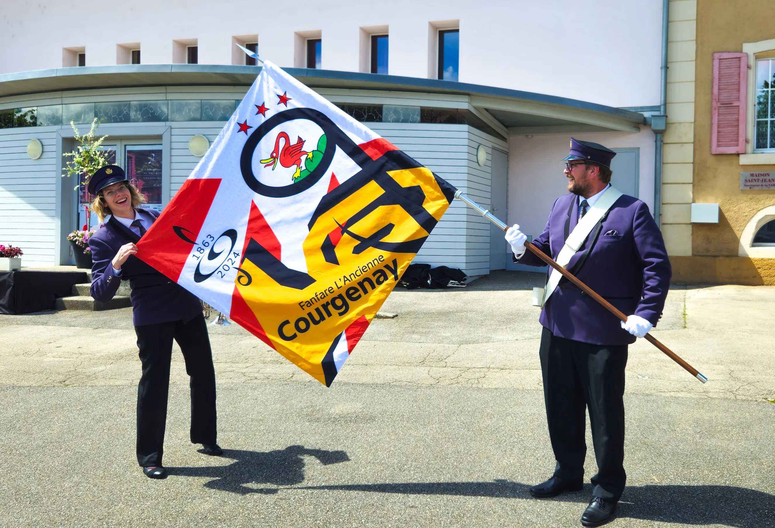 « La fanfare l'Ancienne de Courgenay existe depuis 1863. Elle a depuis sa création, arboré 3 bannières différentes. Cette année pour la fête cantonnale de musique, la fanfare a décidé de renouveler sa bannière vieille de plus de 45 ans. Elle représente les armoiries du village et du canton du Jura tout en évoquant la musique.